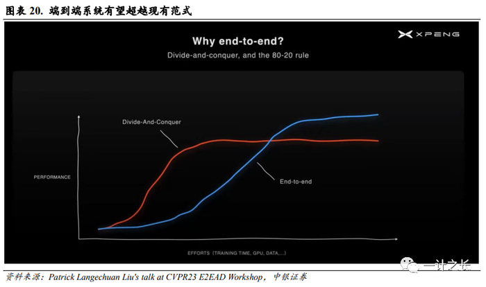 奇点临近,端到端系统有望超越现有范式。根据小鹏XPILOT总监Patrick Liu在CVPR 2023上的演讲,分模块的方式允许开发人员以最少的努力快速工作,但通常会导致自动驾驶性能上限为80%,而端到端以全局最优为导向,相比传统分模块的范式具备更高上限。然而在端到端系统起步初期,需要重复多次才能不断突破性能天花板。从图中我们可以看出,当端到端系统达到现有技术水平的时间点后,将会快速超越技术栈。