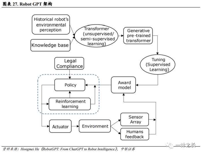 RobotGPT与ChatGPT技术路径相似,生成模型有望加快Robot GPT进程。Robot GPT不需人类编程,只需人类用自然语言的方式来进行记录。根据《RobotGPT: From ChatGPT to RobotIntelligence》,RobotGPT框架图思路类似于ChatGPT:ChatGPT的原理可理解为文字-文字的接龙,而Robot GPT原理是文字/语言/各类传感器接收的信号-动作接龙,两者皆是通过深度学习和强化学习构建端对端AI大模型。