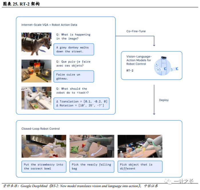 RoboticTransformer主要针对控制场景。RoboticTransformer 2(RT-2)是视觉语言行动(VLA)模型,它从网络和机器人数据中学习,并将这些知识转化为通用指令以控制机器人。RT-2具备较强的思维链能力,可以完成多步骤逻辑推理,能够用复杂文本指令直接操控机械臂,中间不再需要将其转化成简单指令,通过自然语言就可得到最终的行动。在面对图像输入时,RT-2模型在输入图像数据后会首先输出语言规划结果,再把语言规划结果分解成动作,控制机器人完成。RT-2在物流、制造、安保等领域应用广泛。