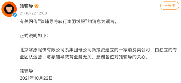 2021年10月22日,猿辅导官方发布微博表示“将转行卖羽绒服”的消息为谣言