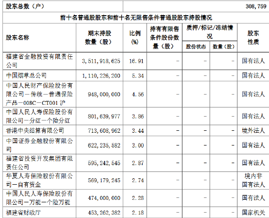 据公开资料显示,兴业银行的前十大股东分别为福建省金融投资有限责任公司、中国烟草总公司、中国人民财产保险股份有限公司-传统-普通保险产品-008C-CT001 沪、中国人民人寿保险股份有限公司-分红-个险分红、香港中央结算有限公司、中国证券金融股份有限公司、福建省投资开发集团有限责任公司、华夏人寿保险股份有限公司-自有资金、中国人民人寿保险股份有限公司-万能-个险万能、福建省财政厅。
