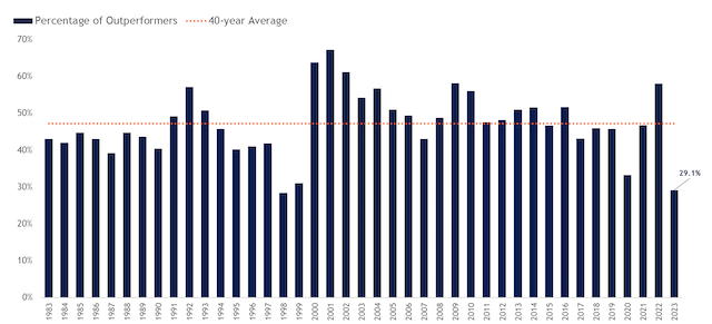 LPL金融研究的统计显示,截至12月27日,科技七巨头对标普500指数的涨幅贡献率达到60%。与此形成鲜明对比的是,只有约29%的标普500成分股企业在总回报率上跑赢大盘指数。2023年,跑赢大盘的美股企业比例料将跌落至过去40年来的低位。