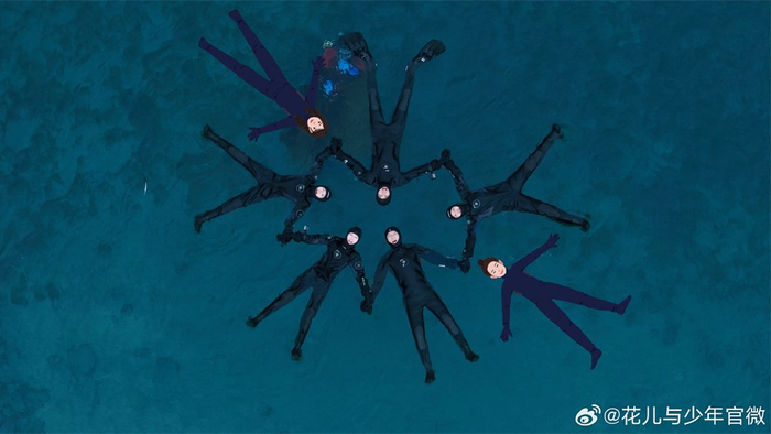 潜水即将结束之时,花少团手拉着手完成了一张“五角星”合照。