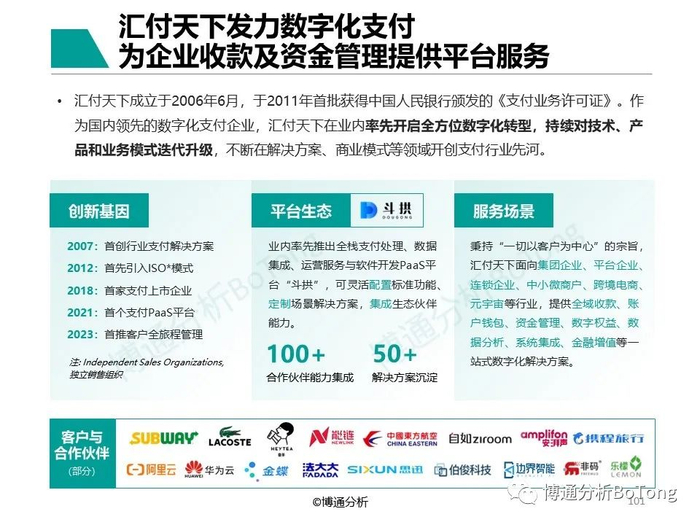 ◆近日,博通分析发布了《支付行业企业数字化服务专题分析2023》报告。博通表示,汇付天下于2011年首批获得中国人民银行颁发的《支付业务许可证》,并于业内率先开启全方位的数字化转型,持续对技术、产品和业务模式迭代升级,不断在解决方案、商业模式等领域开创支付行业先河。