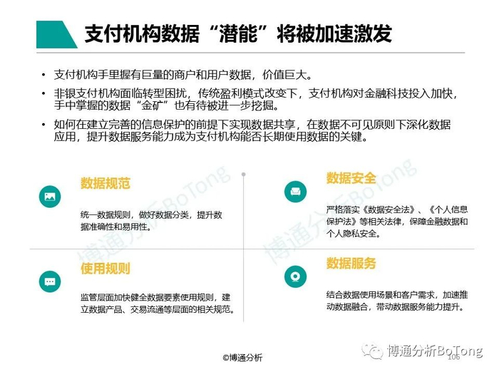 博通认为,未来金融机构对场景的开拓和探索将会持续,对新技术和支付渠道的利用也将增加。如何在建立完善的信息保护的前提下实现数据共享,在数据不可见原则下深化数据应用,提升数据服务能力成为支付机构能否长期使用数据的关键。