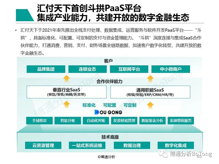 博通表示,汇付天下于2011年首批获得中国人民银行颁发的《支付业务许可证》,并于业内率先开启全方位的数字化转型,持续对技术、产品和业务模式迭代升级,不断在解决方案、商业模式等领域开创支付行业先河。2021年,汇付推出全栈支付处理、数据集成、运营服务与软件开发PaaS平台“斗拱”,能灵活配置产品与服务、快速定制解决方案,提供各类报表和数字化系统集成能力。目前已集成100余类合作伙伴能力,沉淀50多项场景解决方案,希望与客户共建开放的数字金融生态。