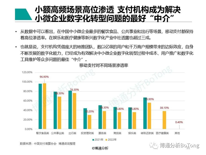 与此同时,网络支付普及率持续增加,为支付数字化服务奠定了流量基础。2023年上半年非银支付机构的网络特约商户规模实现连续两个季度同比大幅增长,第二季度增幅接近一倍,再次证明了支付机构依然是触达商户的第一“入口”,能够以最小成本、最大限度、最便捷地帮助商户进行数字化改造。随着移动支付在小额高频场景中保持高位渗透,支付机构也成为解决小微企业数字化转型问题的最好“中介”。