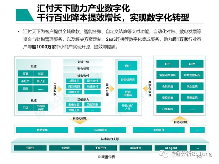 汇付天下为客户提供全域收款、智能分账、自定义结算等支付功能,自动化对账、数电发票等资金与财税管理服务,以及解决方案定制、SaaS连接等数字化集成服务,助力超1万家行业客户与数百万家中小商户实现开源、提效与提质。