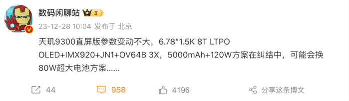 据数码闲聊站暗示,vivo X100s预计将采用6.78英寸的1.5K 8T LTPO OLED直屏,搭载天玑9300处理器,后置三摄为①IMX920 ②JN1 ③OV64B 3X潜望长焦,但目前电池快充方案还没定下来,5000mAh+120W方案在纠结中,可能会换80W超大电池方案,大家是想等蓝厂的直屏影像旗舰还是说想看到蓝厂的8G3直屏影像旗舰?