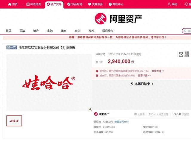 扬子晚报/紫牛新闻记者注意到,12月28日,3.9万股个人持有的浙江娃哈哈实业股份有限公司股份在阿里资产平台拍卖成交。这次拍卖的起拍价定为70万元,经过4次竞价后最终以87万元的价格成交,溢价率为24.3%,折合每股22.3元。