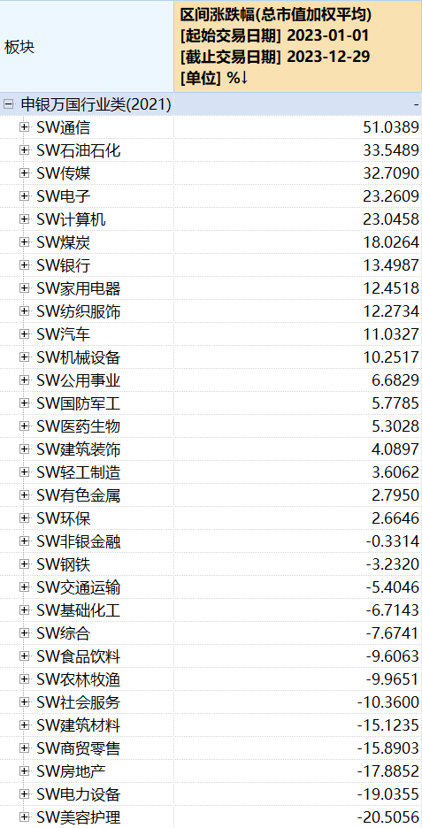 具体来看,通信板块2023年实现领涨,上涨51.04%,也是今年唯一一个涨幅超过50%的板块。