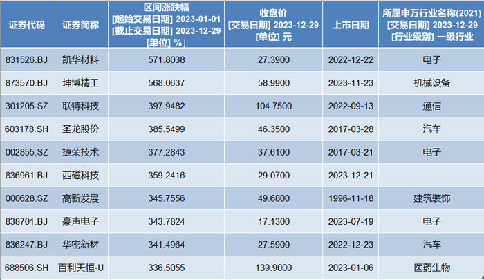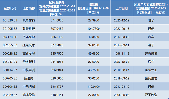 高新发展(000628)、华密新材(836247)、中航电测(300114)、新诺威(300765)、中际旭创(300308)和鸿博股份(002229)全年涨幅均超过300%,分列第五至十名。