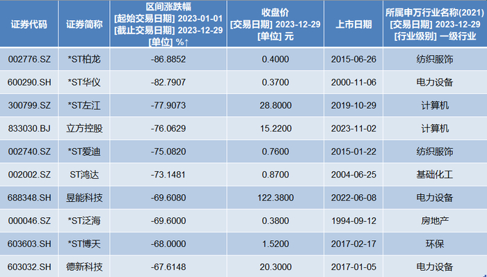 具体来看,*ST柏龙(002776)领跌2023年A股市场,全年大跌86.89%。*ST华仪(600290)全年跌幅同样超过80%,下行82.79%。