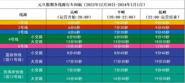 为保障节假日期间市民朋友安心乘车,放心出行,青岛地铁提前对元旦客流特征进行分析,制定专项运力保障措施,其间各线路均安排备用列车,视客流情况组织上线加开,适时补充运力。各线路元旦假期行车间隔如下:
