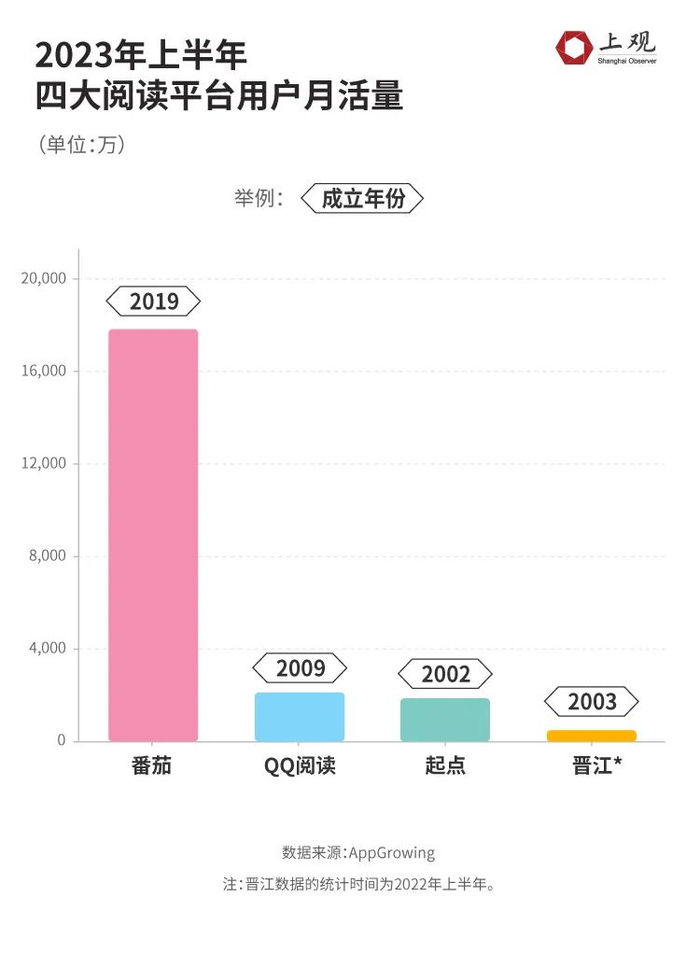根据AppGrowing监测数据,2023年上半年番茄小说的月活用户为1.75亿,而QQ阅读和起点读书分别为2079万和1830万。晋江的月活用户则只以百万计。