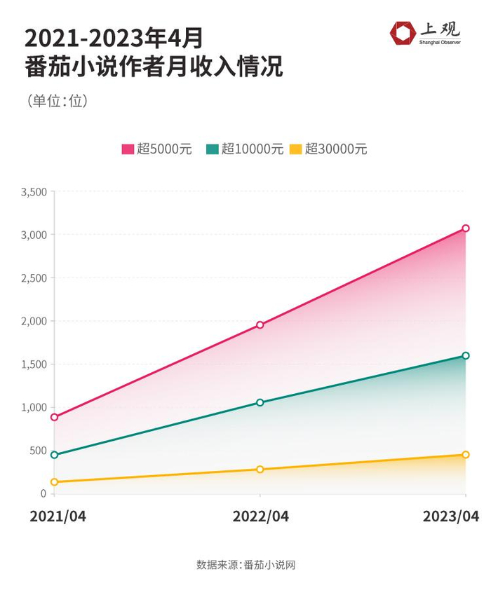 从番茄头部签约作家的收入来看,自2021年至2023年,收入超5000、10000元的作家数量分别增长至3070位、1598位,增幅均超过250%,收入超30000元的作家也增加不少,从138位上升至454位。