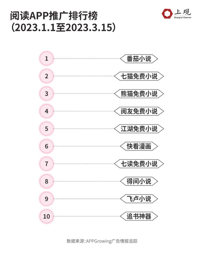 从数据来看,免费阅读APP也确实在引流上花了不少力气。数据显示,2023年1-3月,在阅读APP中,推广买量最多的为番茄,紧随其后的便是七猫。纵观整个推广排行榜,排名前十的阅读APP中,免费阅读APP便占据6席。