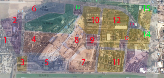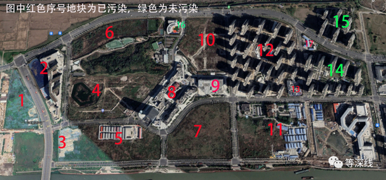 苏州绿岸被污染地块示意图,其中的红色地块为已确认污染,陆家嘴的公告,未提及14号、15号、16号地块是否有污染。 《等深线》记者 程维/ 制图