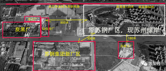 苏州宝化炭黑的运河西岸,是苏钢集团新厂区。苏钢集团的新厂区距离苏州绿岸(苏钢集团老厂区)最西侧的3号地块的最近距离,仅为300米。