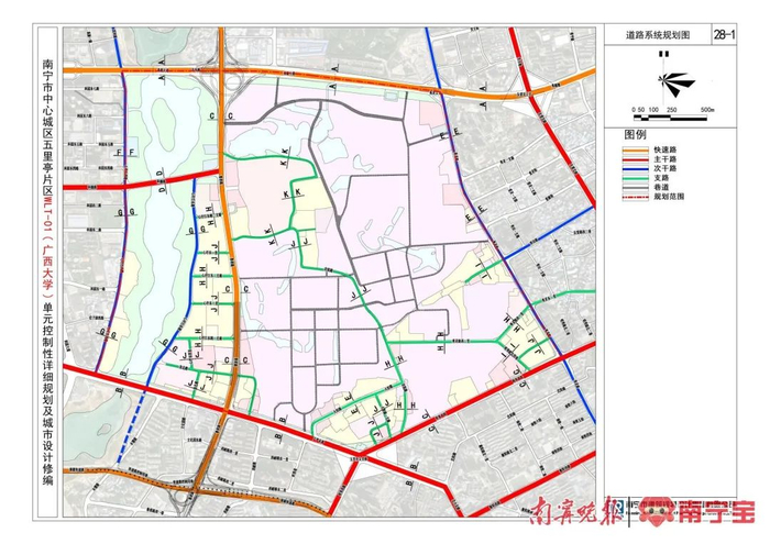 根据土地利用规划图显示,五里亭片区WLT-01(广西大学)单元范围为北至秀厢大道、南至大学路、西至心圩江西路、东至秀灵路,横跨中心城区友爱片区、五里亭片区。