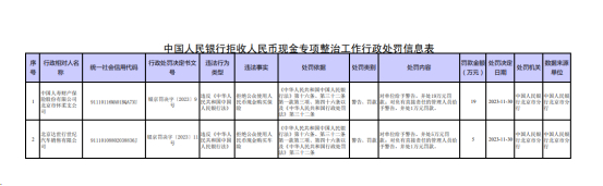 同日,人民银行还发布了拒收人民币现金专项整治工作行政处罚情况,依法对2家拒收人民币现金的单位及相关责任人作出经济处罚。具体来看,中国人寿财产保险股份有限公司北京市怀柔支公司因拒绝公众使用人民币现金购买保险,被处警告、罚款,其中,单位被罚19万元,负有直接责任的管理人员被罚1万元。北京达世行世纪汽车销售有限公司因拒绝公众使用人民币现金购买车险,被处警告、罚款,其中,单位被罚5万元,负有直接责任的管理人员被罚1万元。