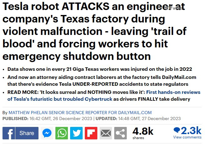 12月26日(GMT),英媒《每日邮报》(Daily Mail)发布名为《特斯拉机器人在剧烈故障期间袭击该公司德克萨斯州工厂的一名工程师》的报道,称一名特斯拉工程师被机器人“攻击”,导致左手严重受伤,截至发稿,报道已被分享4800余次,评论也高达2300余条。