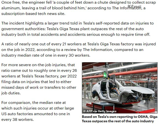 2022 年特斯拉德克萨斯州超级工厂的每21名工人中,就有近1人在工作中受伤,而行业中位数为每30名工人中就有1人受伤,特斯拉的工伤率远高于其他企业。