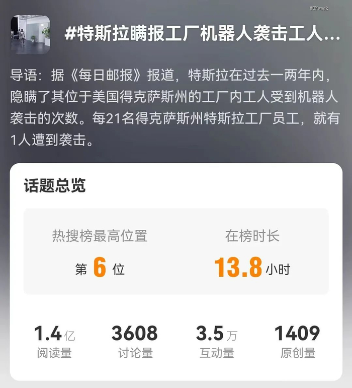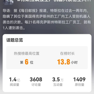 相关话题热度不仅*百度热搜榜一,更“喜提”微博#特斯拉瞒报工厂机器人袭击工人次数#、#特斯拉机器人暴起伤人#双热搜。