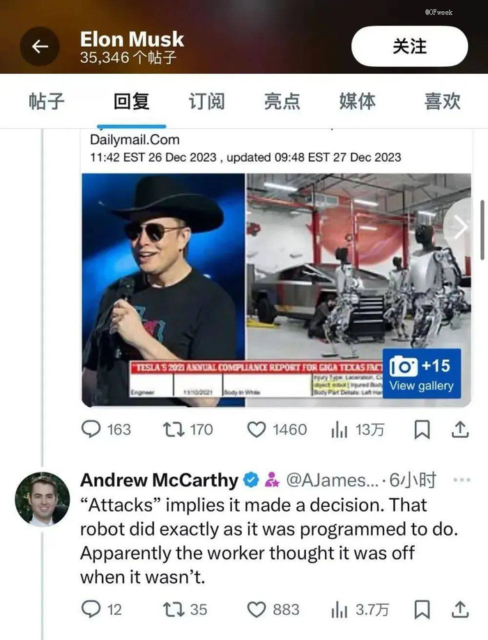 而在此时,X平台上一名“Whole Mars Catalog”的网友指出《每日邮报》有诱导公众之嫌,并称“虽然工程师受伤很可怕,但并不意味着机器人会造反。”