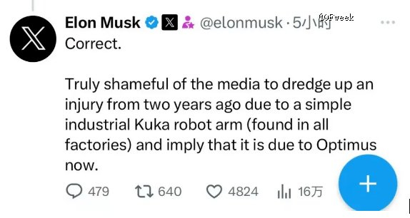 事件发酵后,一向走在“冲浪*线”的马斯克在自家社交平台回应称,这是媒体挖出来两年前工业机械臂造成的意外事故,并做了误导性暗示,这种做法“真是可耻”!