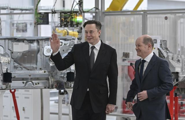 当地时间2022年3月22日,德国勃兰登堡州,在历时约两年筹建后,特斯拉工厂正式在毗邻柏林的勃兰登堡州格林海德开业,现场举行了首批德国生产的Model Y的交付仪式。图为德国总理朔尔茨和特斯拉CEO马斯克出席。视觉中国 图
