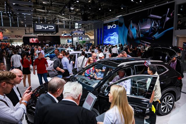 当地时间2023年9月6日,在德国慕尼黑举行的2023国际车展上,众多参观者围聚在比亚迪展台前,观看并体验该品牌的新能源汽车。视觉中国 图