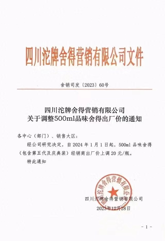 胜马财经获悉,12月28日,四川沱牌舍得营销有限公司发布一则关于旗下产品价格调整的通知。通知显示,经公司研究决定,自2024年1月1日起,500ml品味舍得(包含第五代及庆典装)经销商出厂价上调20元/瓶。