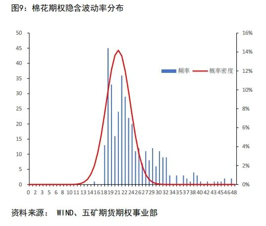 (1)在过去一年,棉花期权隐含波动率先升后降,下半年以来波动区间加大;从棉花期权隐含波动率分布来看,中位数约为0.22,在0.18-0.38之间波动且波动右偏。