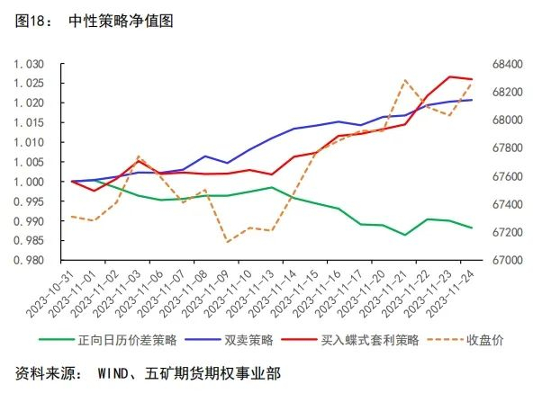 静态期权套保:买入平值或者虚值一档看跌期权规避现货下跌风险、卖出虚值看涨期权降低套保成本,下跌时期权对现货头寸起到保护作用,上涨时结合现货销售平仓了结。