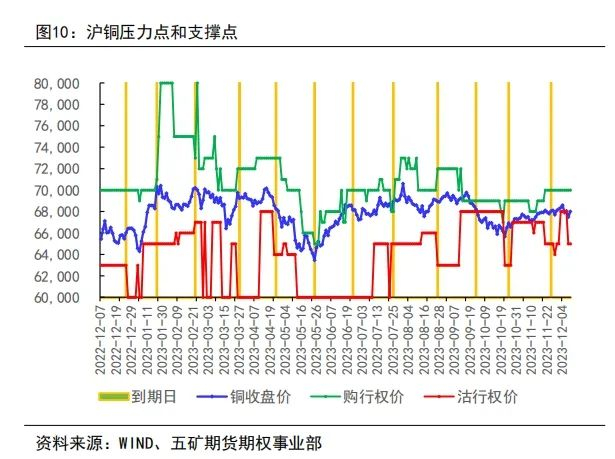(1)从期权卖方的角度来看,2023年沪铜期权波幅收窄,且下方支撑点逐渐上升,上方压力点逐渐趋于平稳,预计明年沪铜期权压力点和支撑点震荡区间将扩大。