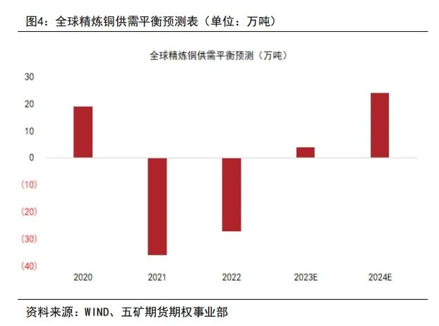 (1)从全球精炼铜的供需平衡预测表来看,今年小幅度过剩约为5万吨,预估明年过剩幅度较大达到25万吨。