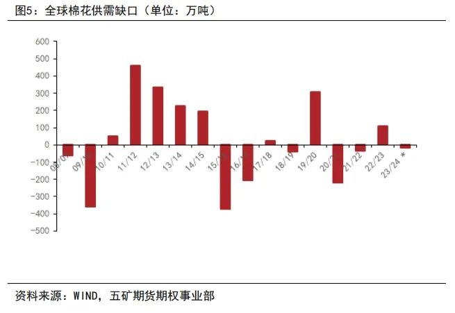 (2)从全球棉花的供需缺口来看,22-23年度过剩约为100万吨,预计23-24年度缺口20-30万吨。