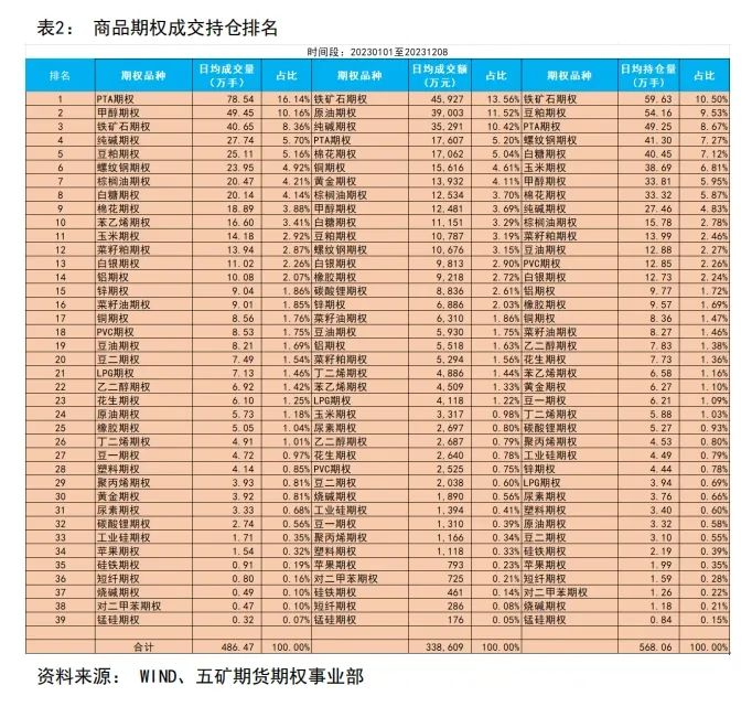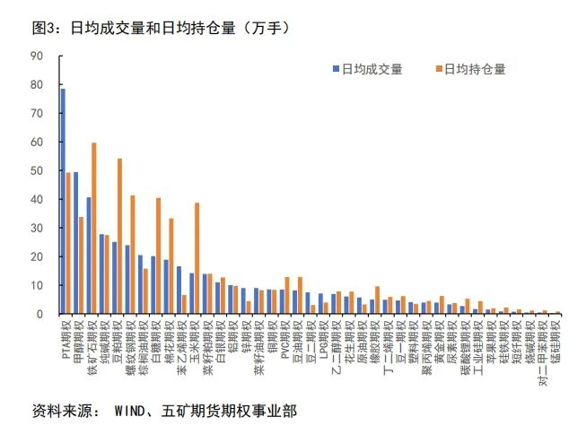 从商品期权的市场参与度来看,日均持仓量排在前3名的是铁矿石期权、豆粕期权和PTA期权,约为50万手及以上。