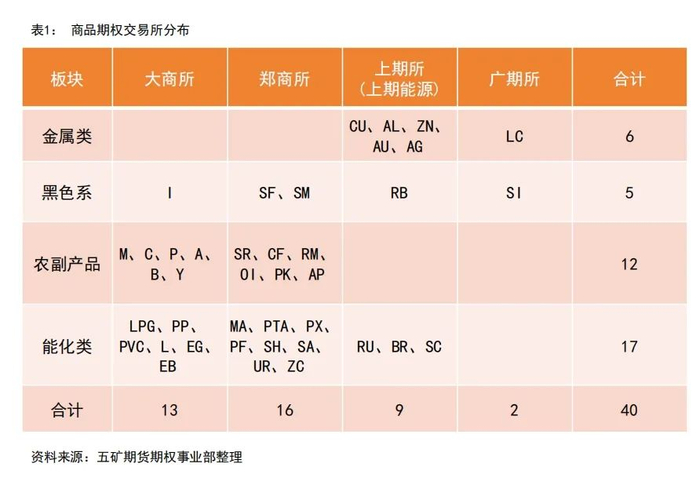 交易所期权:商品期权分布在各大期货交易所,其中上期所(上期能源)共9只、郑商所16只、大商所13只和广期所2只。