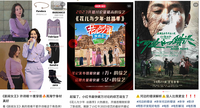 《新闻女王》热播期间,随处可见金句解读、同款穿搭以及高海宁暴涨粉至56万;神综《花少5》被扒路人偶遇及同款Citywalk路线相关笔记阅读量破了1万+;无论商业文艺,《孤注一掷》《河边的错误》等院线片也总能在全站掀起讨论热潮。