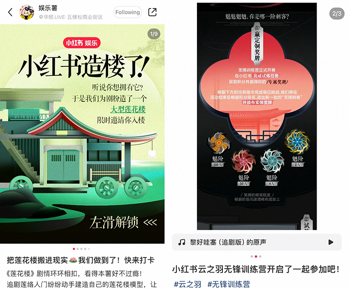8月,《莲花楼》剧方联动小红书官号「娱乐薯」以「小红书造楼了!」主题为剧粉策划了线下展活动;9月,《云之羽》剧方发起了「无锋训练营」主题活动鼓励用户在美学、情感、时尚、推理、塑形五大主题下创作笔记,以争夺与剧集元素挂钩的“魑魅魍魉”奖牌。