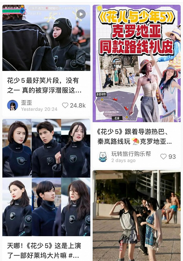 《花少5》这季出圈后在小红书上涌现了一大批安利图文,有旅游博主扒皮花少团同款克罗地亚巡游路线、有base海外的博主发布游客版自制花少团花絮、更有剧中导游大哥惊喜现身独家爆料录制幕后,这些多维度图文都是在给节目花式带流量。