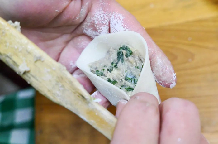 一颗小小的鱼包中包含鲜、香、爽、滑、嫩等多重滋味和口感,同样承担了南岗鱼锅中的“重头戏”。鱼包外形酷似云吞,最特别之处是其外皮是由鲮鱼肉制成的。“鱼皮”的制作方法与鱼角相似,以纯鲮鱼肉做成馅,压成纸一般的薄片,扑上少许面粉,裁成三角状即可。馅料除了鲮鱼肉,还会放入冬菇、腊味等食材。“鱼皮”和馅料在老板娘手中一包一捏,拖着“尾巴”的鱼包就做成了。“鱼包是‘鱼’,肯定有个尾巴啦!”老板娘笑着说。在沸水中翻滚的鱼包,犹如水中畅游的鱼儿般,栩栩如生。