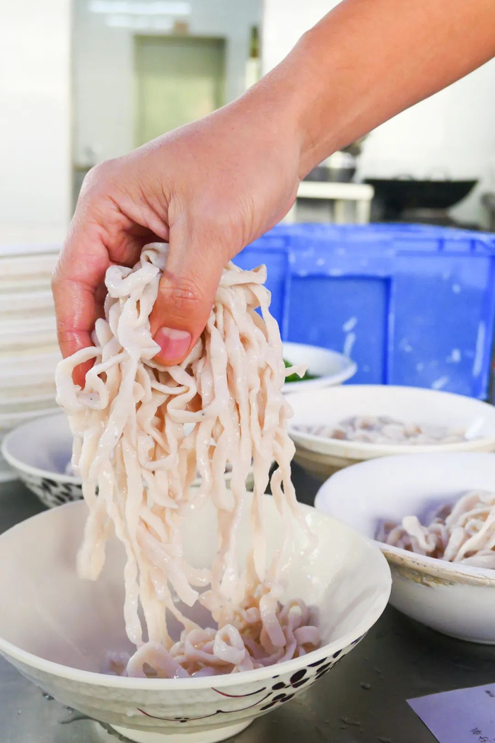 放在面食界,鱼丝面估计会被直接开除“面籍”。因为鱼丝面不是“面”,而是由纯鱼肉制成的。被“挞”至起胶的鲮鱼肉压成薄片,再切成细条,不含一点“面”粉,却比广东的碱水面更为爽口。在锅中稍微汆烫,就能解锁其无比鲜味。