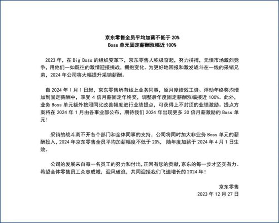 12月27日,京东集团宣布,自2024年1月1日起,京东采销等一线业务人员的年固定薪酬大幅上涨近100%,2024年初京东零售全员将平均加薪不低于20%。