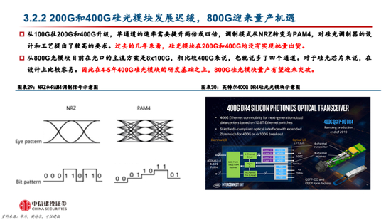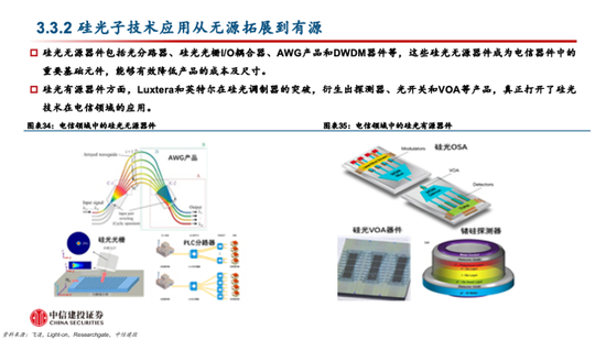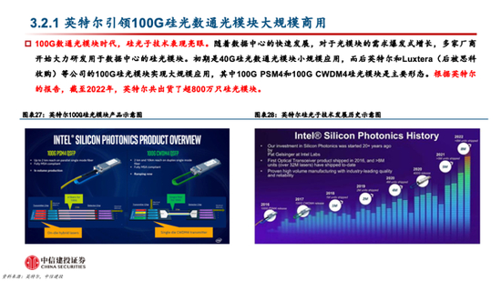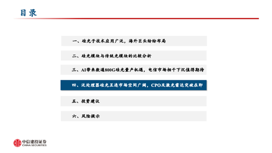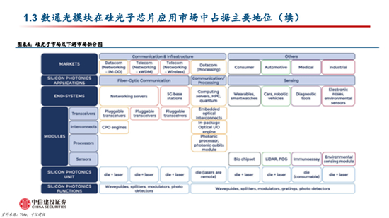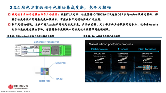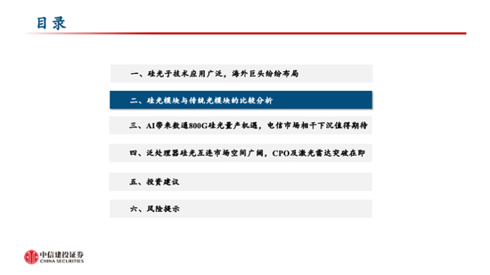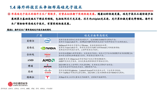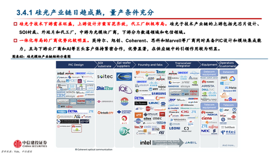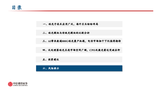 投资机会三:硅光器件及硅光模块。硅光器件和模块是硅光子产业链的主力环节,头部厂商在硅光子技术的深度布局也将影响硅光产品的渗透率。随着硅光子技术的不断发展,多家国内外厂商具备了硅光子技术的设计和封装等能力,有望加速硅光子产品的渗透。