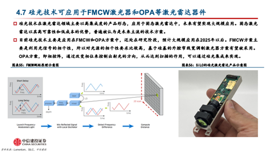 硅光子技术在CPO、光计算和激光雷达等领域应用前景较好。CPO是业界公认的未来更高速率光通信的主流产品形态之一,可显著降低交换机的功耗和成本。硅光引擎是CPO交换机中最佳产品形态之一,有望得到广泛应用。光计算在AI领域快速发展,低功耗的优势驱动硅光子技术产品快速推进。硅光子技术应用在固态激光雷达的FMCW和OPA方案中,高集成度和低成本优势显著。