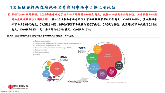 硅光子技术优势显著,数通光模块为下游主要应用场景。海外科技巨头纷纷布局硅光子技术,有望实现高速发展。硅光具有兼容成熟的CMOS工艺、集成度高、封装工艺简化、低成本和低功耗等优势。根据Yole的数据,2022年到2028年硅光子芯片的市场规模的CAGR达到44%,其中数通光模块在硅光子芯片市场中占比达到90%以上,为主要应用场景。Nvidia、Intel、TSMC和Broadcom等科技巨头在光互连等领域争相布局硅光子技术,突破在即。