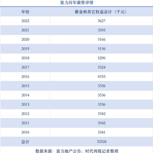 作为富力地产的创始人之一,张力获得的报酬颇丰。据时代周报记者统计,自2010年至2022的13年中,张力累计从富力地产获得薪酬约5252.6万元。